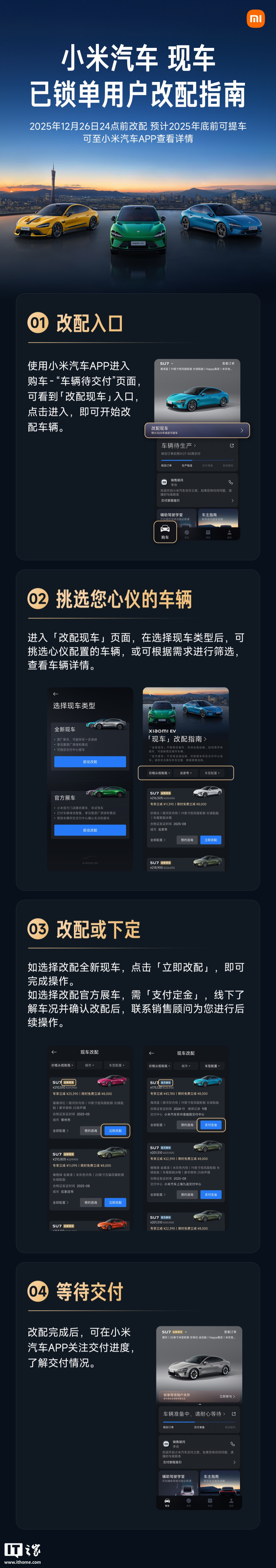 据IT之家了解,12月1日12点,已锁单未交付用户可优先改配同车型现车。12月3日10点,「现车选购」面向全部用户开放。不同现车具体开售时间,以小米汽车App官方信息为准。